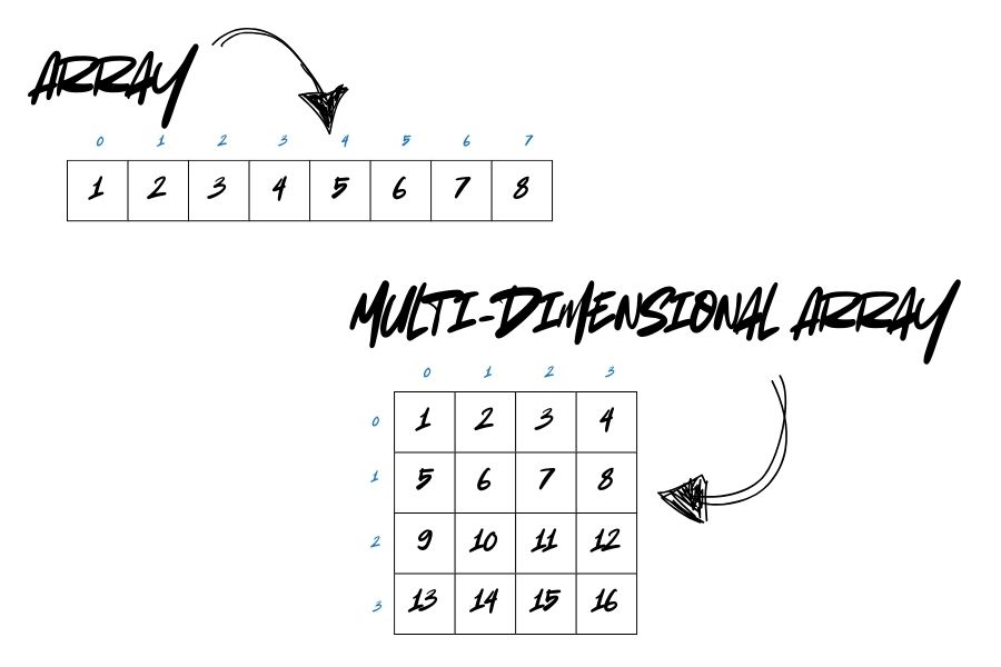 An array can have one or multiple dimensions. A one-dimensional array represents a simple list of values, accessed through a single index, while multi-dimensional arrays are used to organize data in rows, columns, or more complex structures, enabling the representation of more structured data.