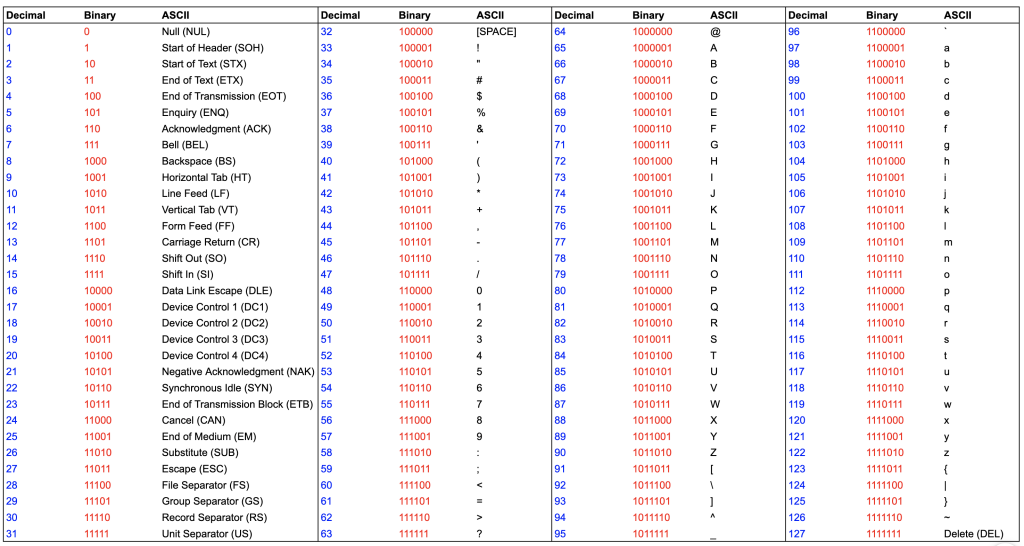 00000101. - The letter A is translated into binary based on tables such as ASCII (for example,